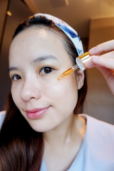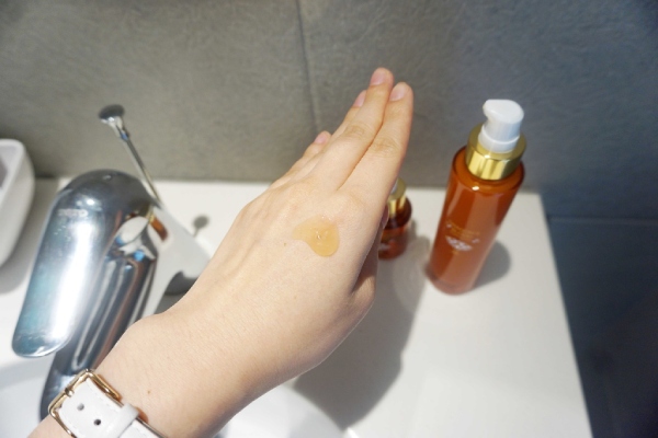 雖然這瓶定位在精華液,但我覺得它的質地就像蜂蜜般非常濃稠,呈現透明的琥珀色,帶著淡淡的植萃的芬芳,很好聞不刺鼻!