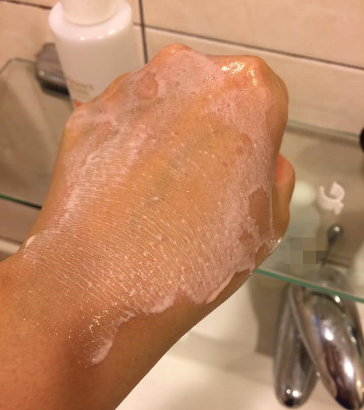 手沾取少量的水,同樣重複畫圓動作,遇水瞬間自動充分乳化,不需要過度搓洗