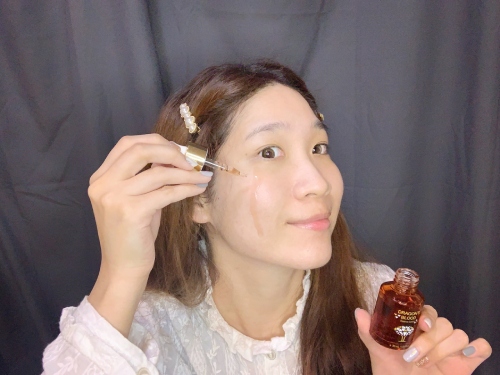 最重要的是,使用過「龍血求麗精華」後的肌膚既不黏不悶、沒有負擔不致粉刺痘痘,水嫩的光澤和細嫩的觸感真的讓我很喜歡!