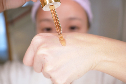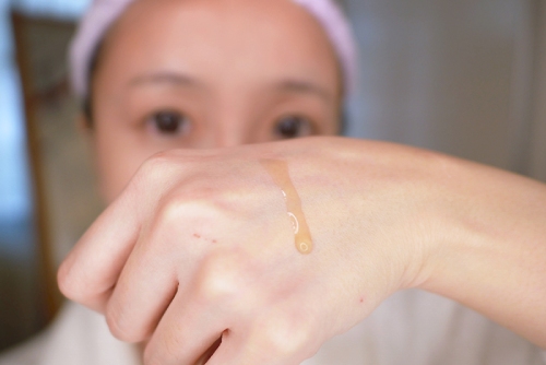 接著將精華液放到手背上後調整用量,有點像化妝時調和粉底液那樣~