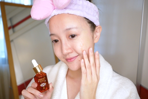 接著在用另一手沾取適量後塗抹到整張臉,我都是從最乾的兩頰先塗抹,再將精華液慢慢帶到臉部的中央~