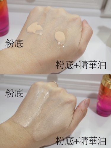 我驚呼啦~有加入精華油的那邊,粉底根本要融入肌膚了,妝感非常的貼
