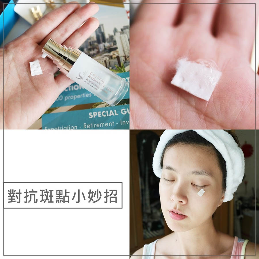 首先把化妝棉剪一小塊再將精華液按壓一滴浸濕化妝棉,貼在斑點處(痘疤、斑點)