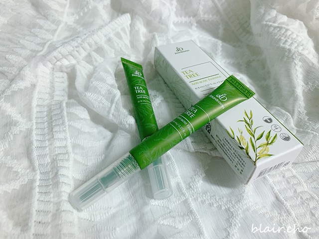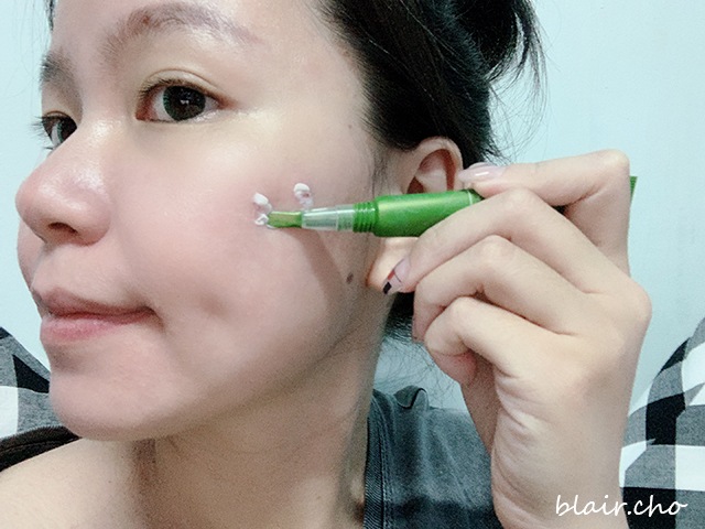 馬上針對痘痘們擦上茶樹K痘精華,扁扁的軟頭,可以兩面用刷的方式很快速地塗抹開來