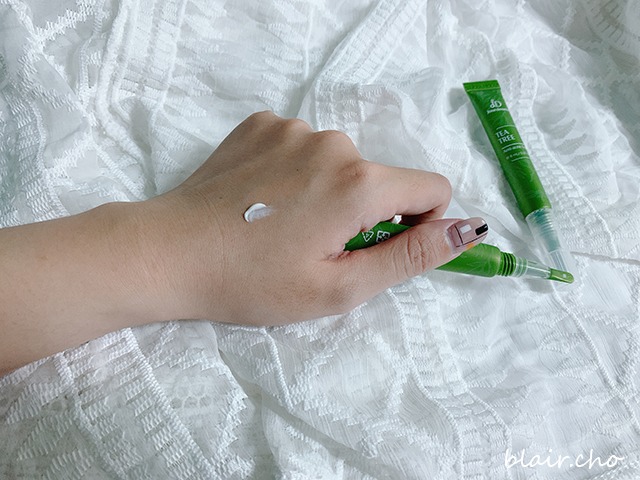 茶樹K痘精華質地是偏向乳霜狀的,但是很好塗開,沒有太過於刺激的味道