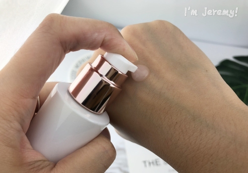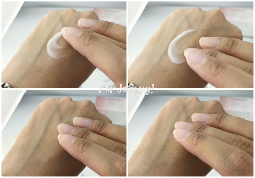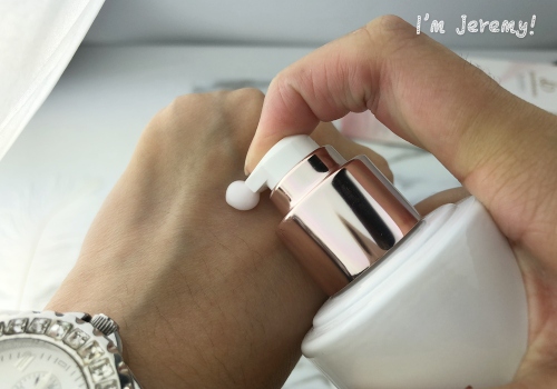 白色乳狀的質地,推開後會隨即化成稍微水狀的感覺,延展性不錯的它,壓取一下的用量,是可以塗滿整個手背的唷!