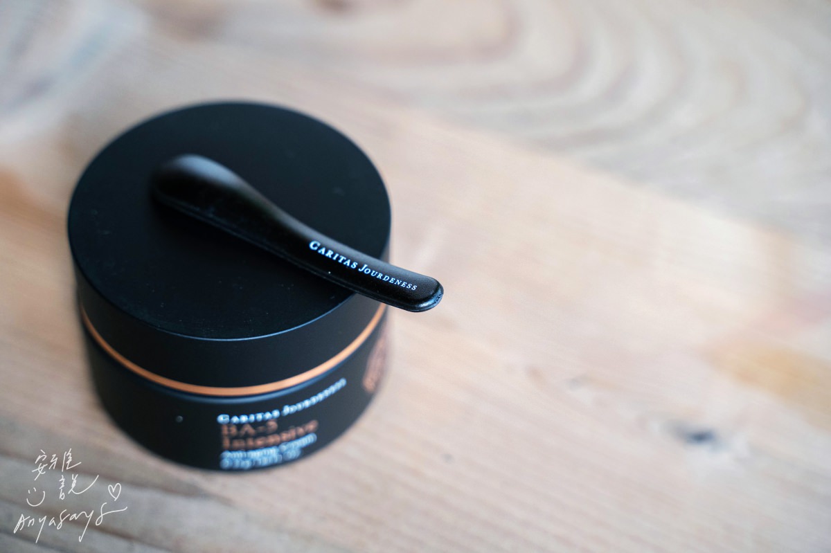 挖杓上寫著 CARITAS 是佐登妮絲獨家研發的植萃抗老亮白配方