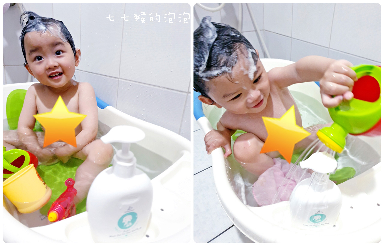有些爸媽可能會買月亮澡盆來幫忙,但小孩又不是雕像,就算不會溜下澡盆,也會東倒西歪的......大人只有一隻手可以用,根本不可能還在那裡很優雅的倒沐浴乳啊!
