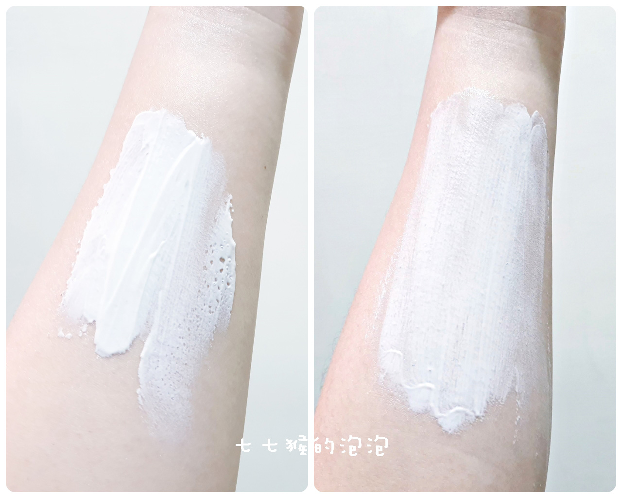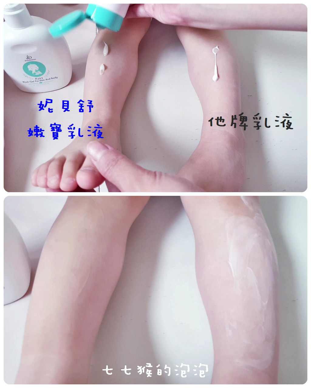 水感質地,清爽不油膩,非常好推開,七猴把它和雙妞原本使用的v牌來做比較,可以發現嫩寶乳液很快就均勻抺開了!