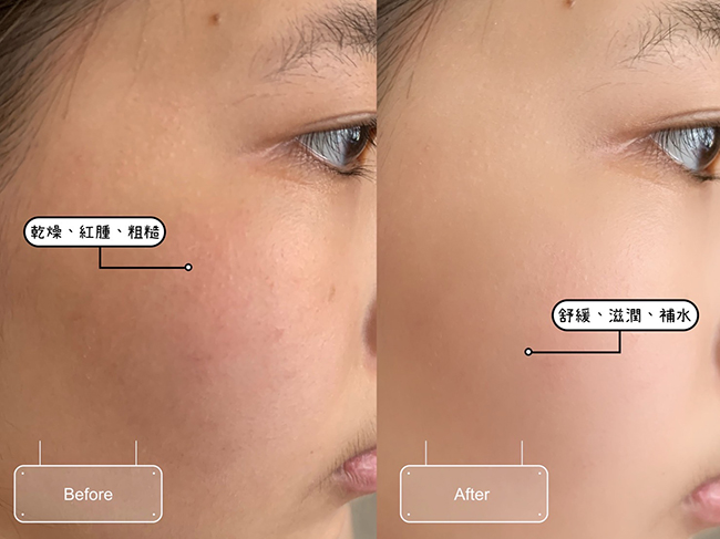大概等個10~15分鐘,發紅的地方就會舒緩,明顯乾燥的地方也會因為舒緩保濕乳而變得比較細嫩