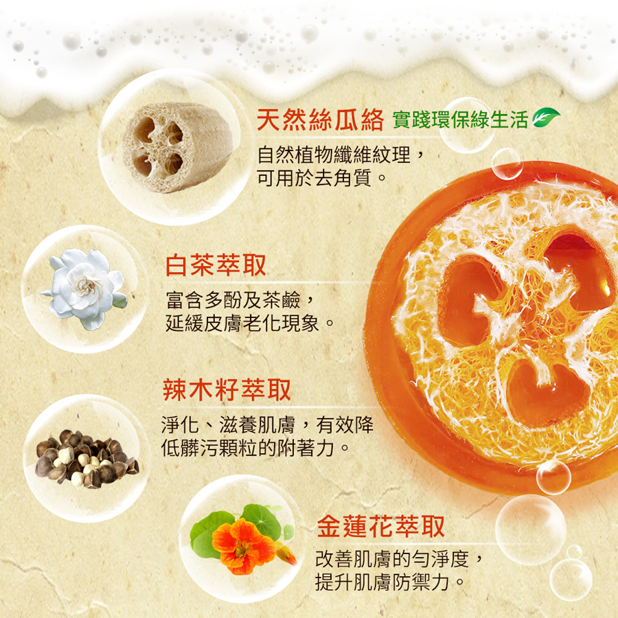 特性:嚴選亞馬遜叢林珍貴龍血樹脂,集結金蓮花、白茶、辣木籽植物萃取入皂,裹著天然絲瓜絡,可幫助肌膚除去老廢角質,搭配特殊香氣,讓人沉浸在沐浴的舒活感。