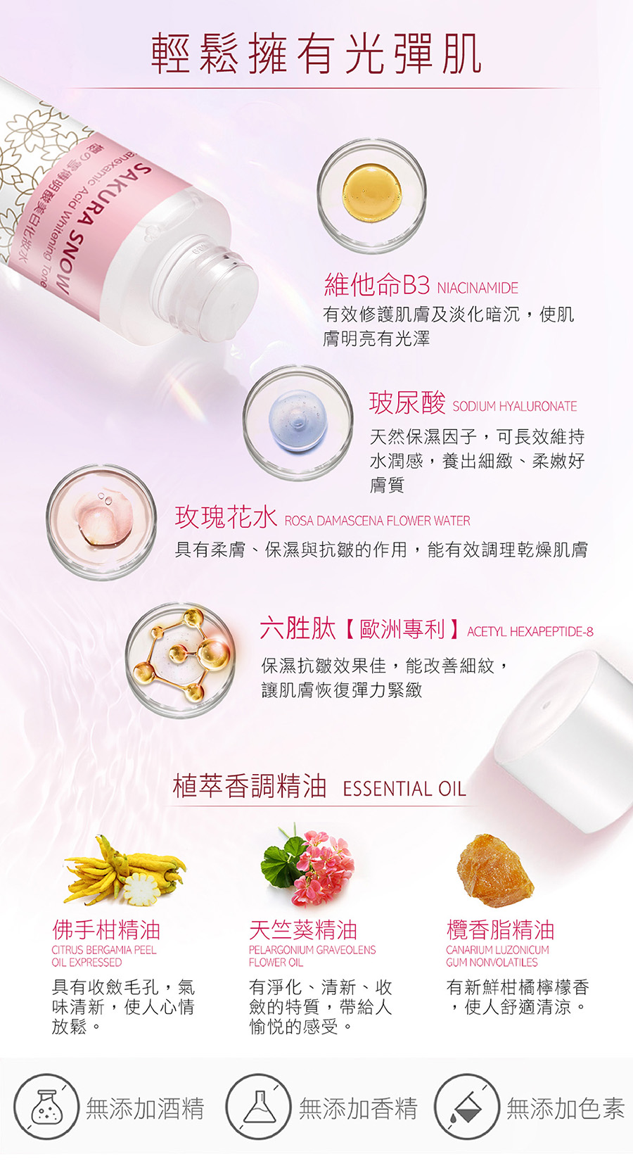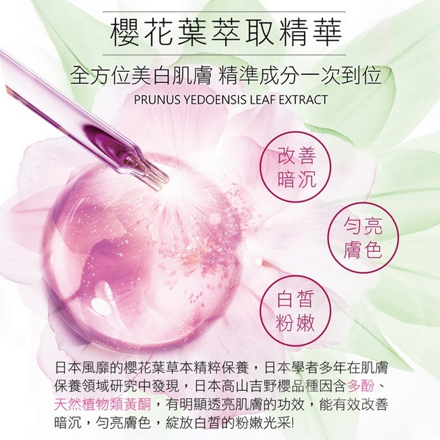 主要成分:櫻花葉萃取、玻尿酸、六胜肽、維生素C糖苷、傳明酸、維他命B3、玫瑰花水