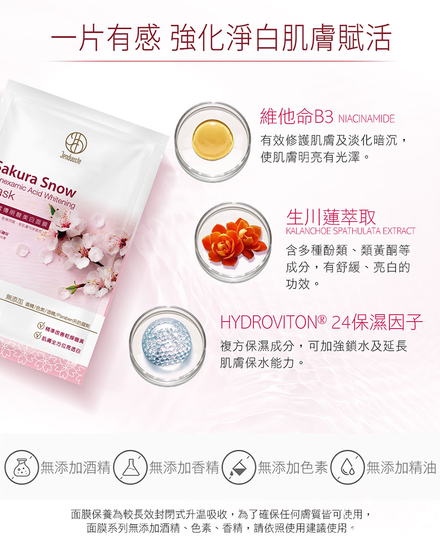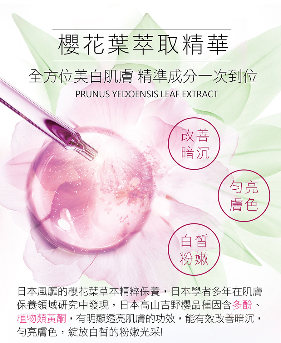 主要成分:櫻花葉萃取、Hydroviton 24保濕因子、維生素C糖苷、傳明酸、卡姆果萃取、山川蓮萃取、維他命B3