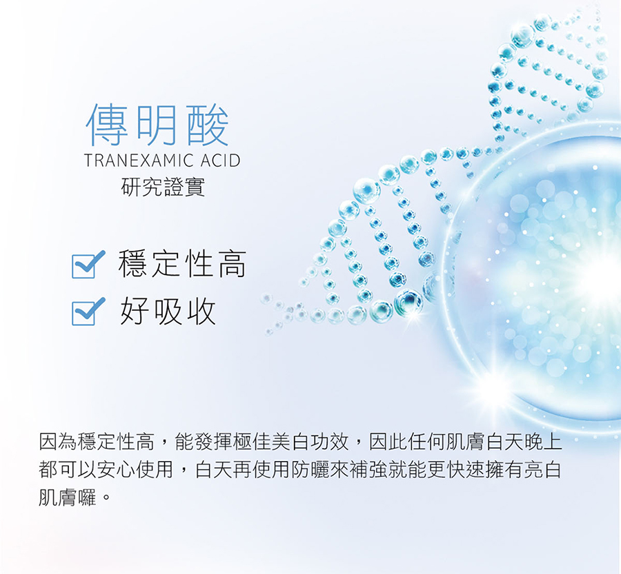 特性:溫和保養配方,不添加香精,富含保濕因子、豐富植物萃取及傳明酸,改善肌膚暗沉、乾燥問題,使肌膚勻淨透亮