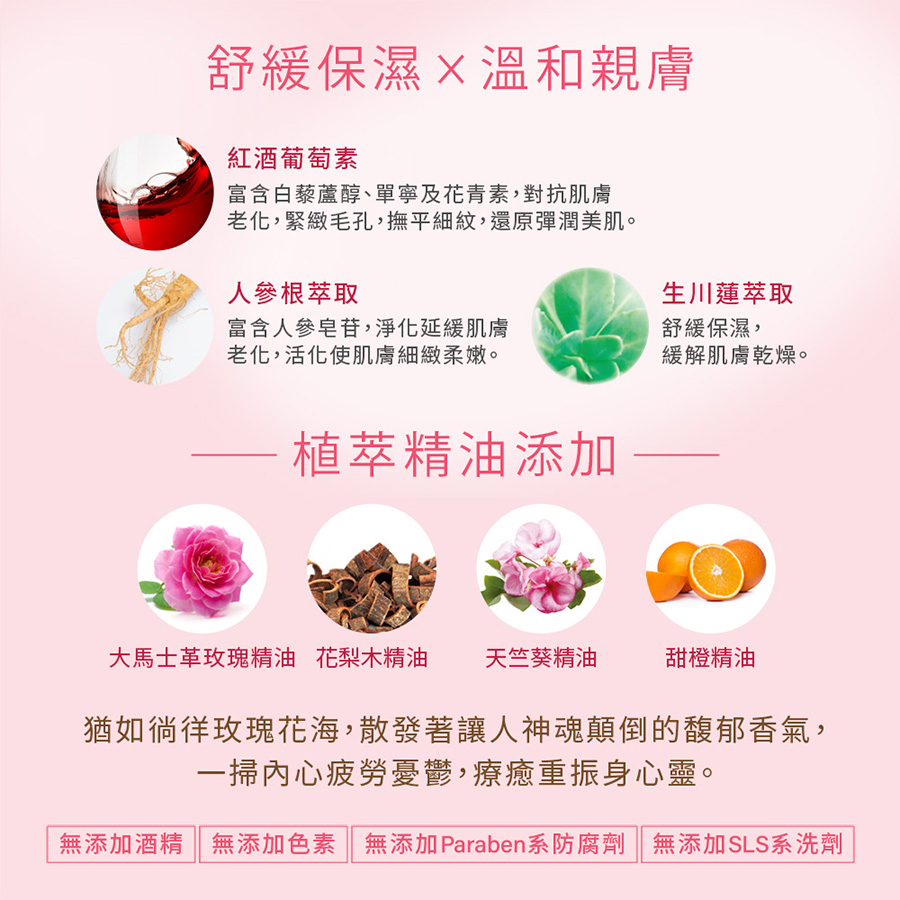 主要成分:人參根萃取、紅酒葡萄素、生川蓮萃取、大馬士革玫瑰精油 、天竺葵精油、花梨木精油、甜橙精油