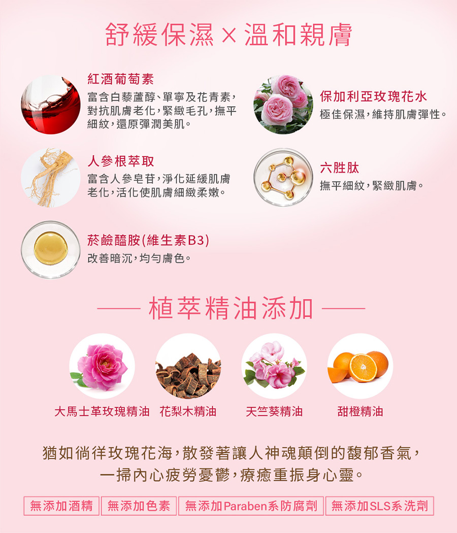 主要成分:保加利亞玫瑰花水、菸鹼醯胺(維生素B3)、六胜肽、紅酒葡萄素、人參根萃取、天竺葵精油、大馬士革玫瑰精油、花梨木精油、甜橙精油