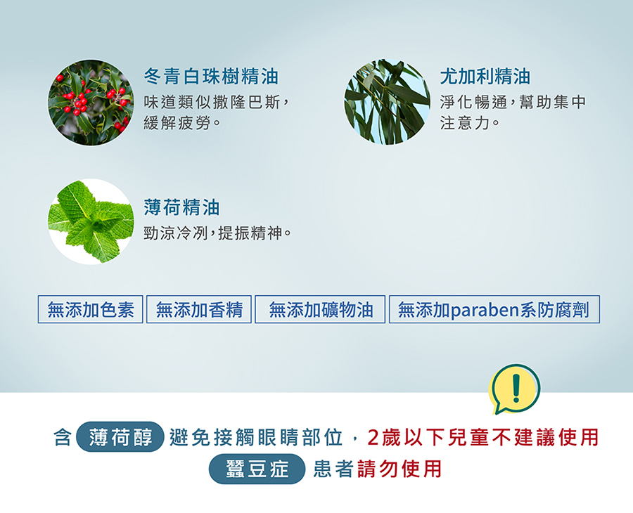 5.内含【薄荷醇】避免接觸眼睛部位,2歲以下兒童不建議使用,「蠶豆症」患者請勿使用。