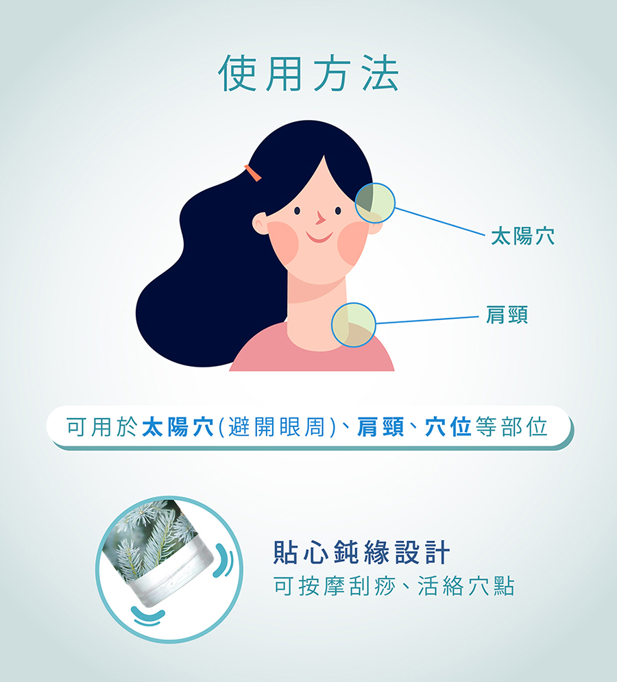 用法:以滾珠頭輕輕塗抹於太陽穴、后頸或其他需要舒緩之肌膚部位,並避免接觸眼睛周圍。