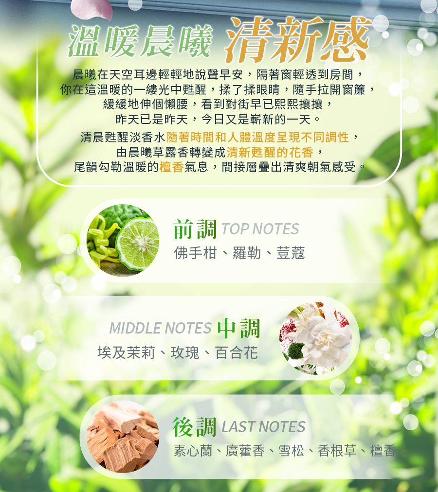特性:清晨甦醒淡香水會隨著時間和人體溫度呈現不同調性,由晨曦草露香轉變成清新甦醒的花香,尾韻勾勒溫暖的檀香氣息,間接層疊出清爽朝氣感受。