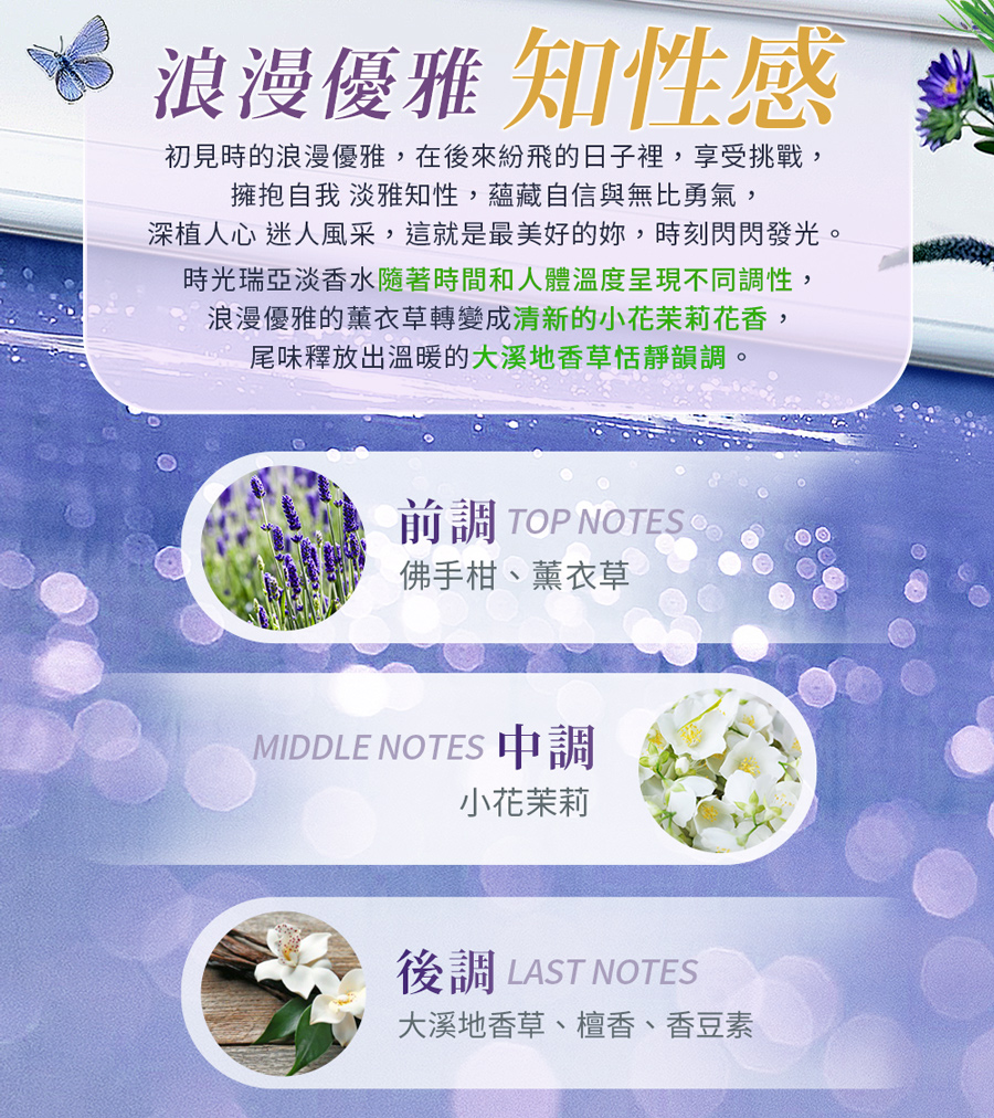 特性:時光瑞亞淡香水會隨著時間和人體溫度呈現不同調性。由浪漫優雅的薰衣草轉變成清新的小花茉莉香味,尾味釋放出溫暖的大溪地香草恬靜韻調。