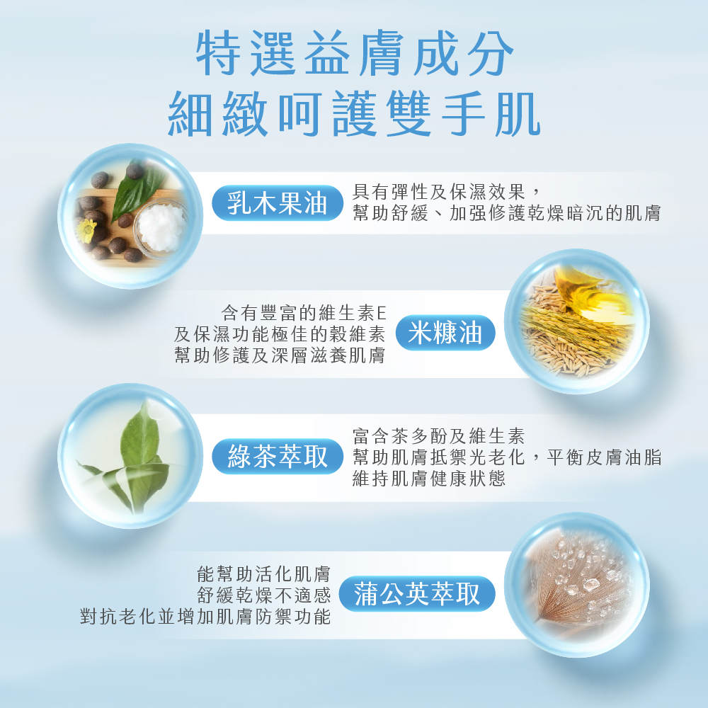 特性:含乳木果油及米糠油和多種植萃滋養保濕成分,可修護手部乾裂現象,使雙手恢復柔嫩光滑不黏膩。