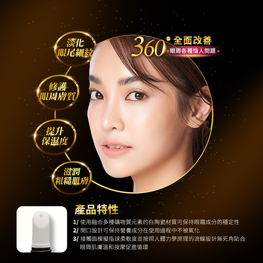 用法:清潔眼部肌膚後,擠出適量於出料口,並使用陶瓷按摩頭從下眼頭往眼尾順著紋理輕點按摩,至肌膚完全吸收。