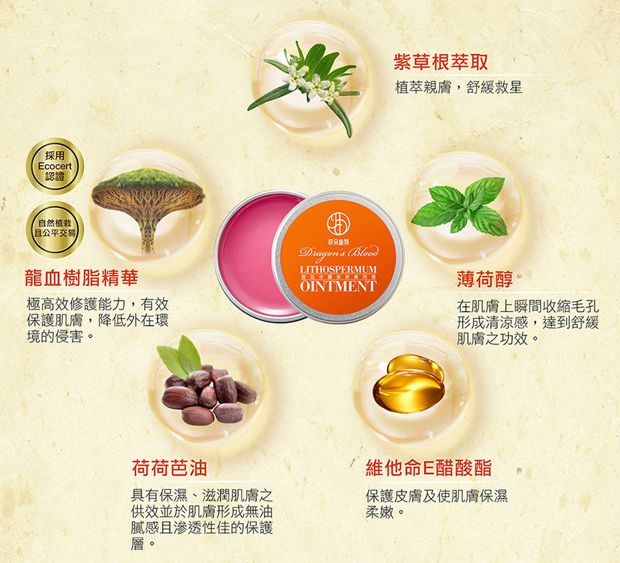 主要成分:凡士林、薄荷醇、維他命E醋酸酯、荷荷巴油、氫化橄欖油、紫草萃取液、丙二醇異硬脂酸酯、香蘭基丁基醚、秘魯龍血樹脂萃取
