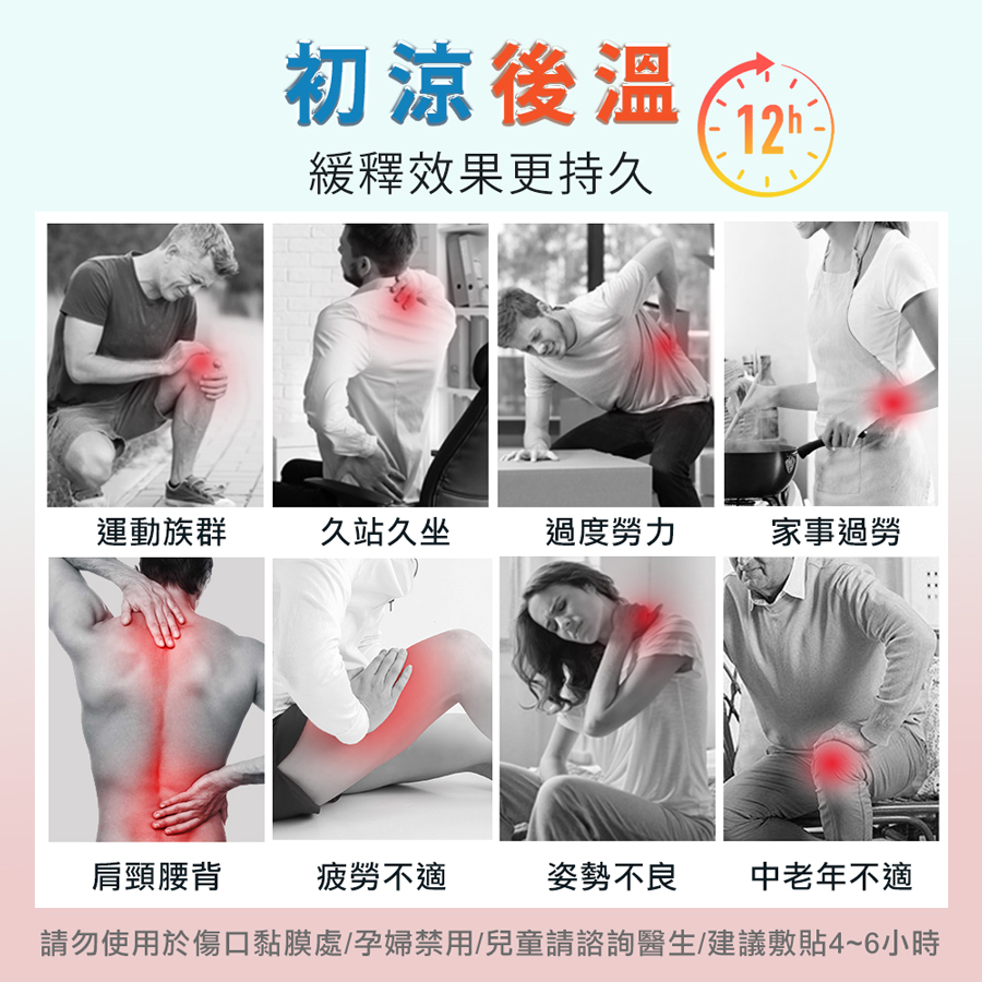用途:做家事、打電腦、爬山、開車、運動後貼於手足、肩、頸、腰、背等部位、舒緩放鬆、增加清涼、舒適、具有保健之作用。