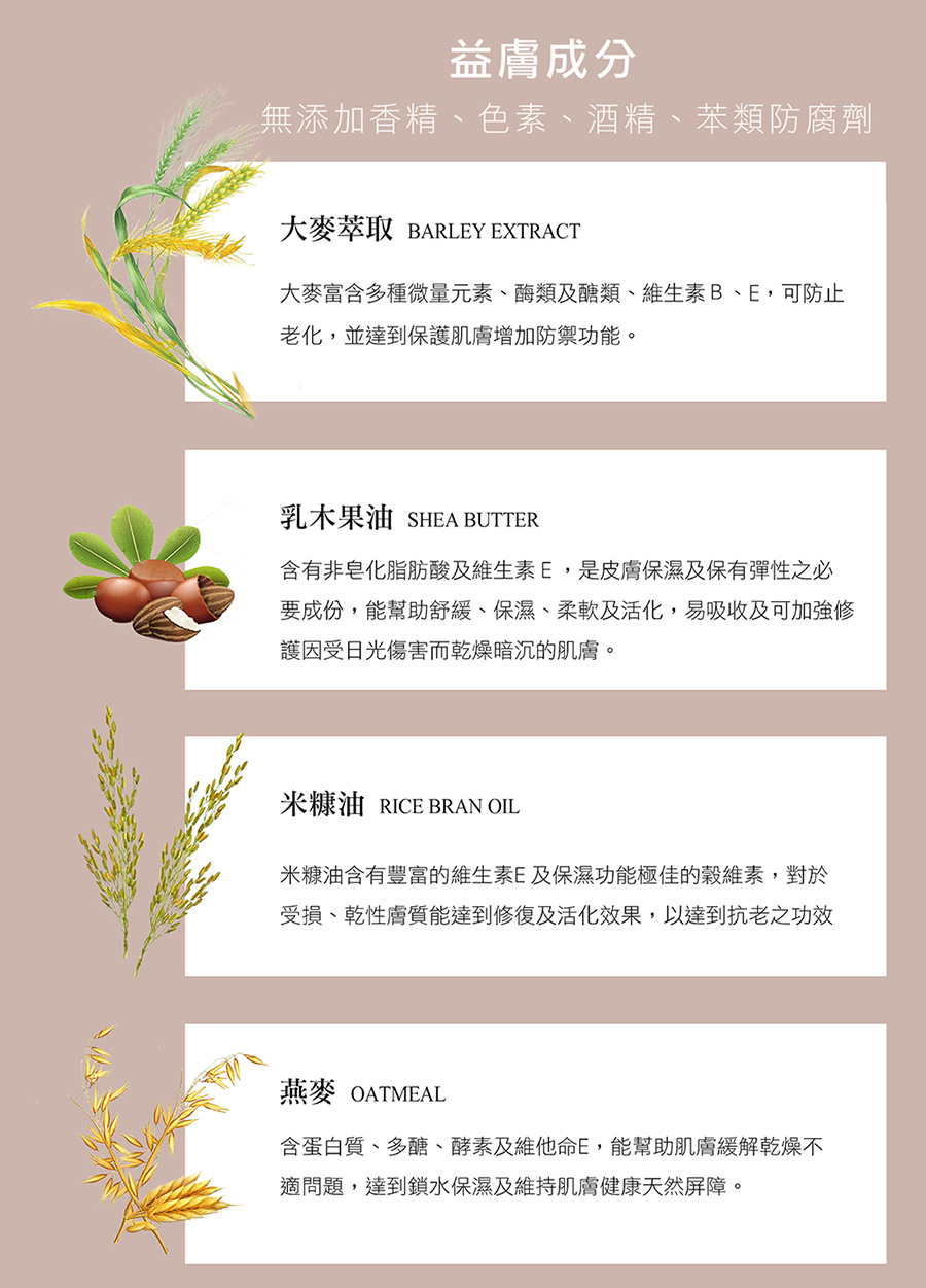 ★燕麥萃取 幫助肌膚舒緩乾燥不適問題