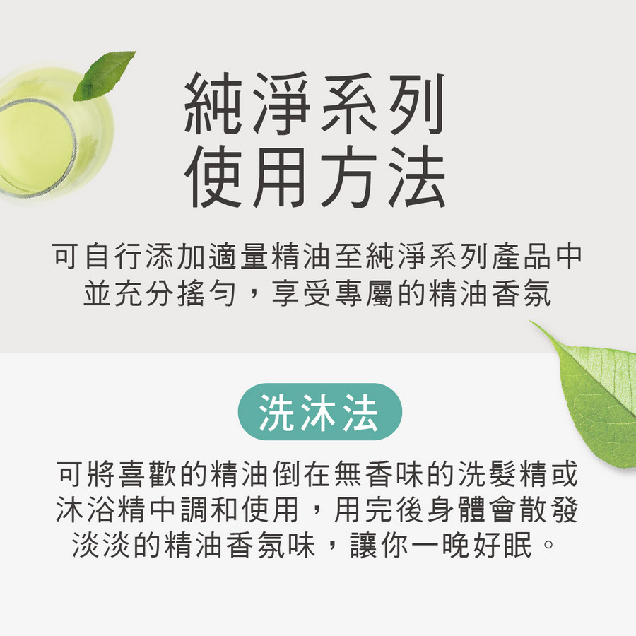 2.可自行添加喜愛的精油味道,取適量精油(約5~10滴)加入沐浴精中並充分搖勻,享受專屬的精油香氣。