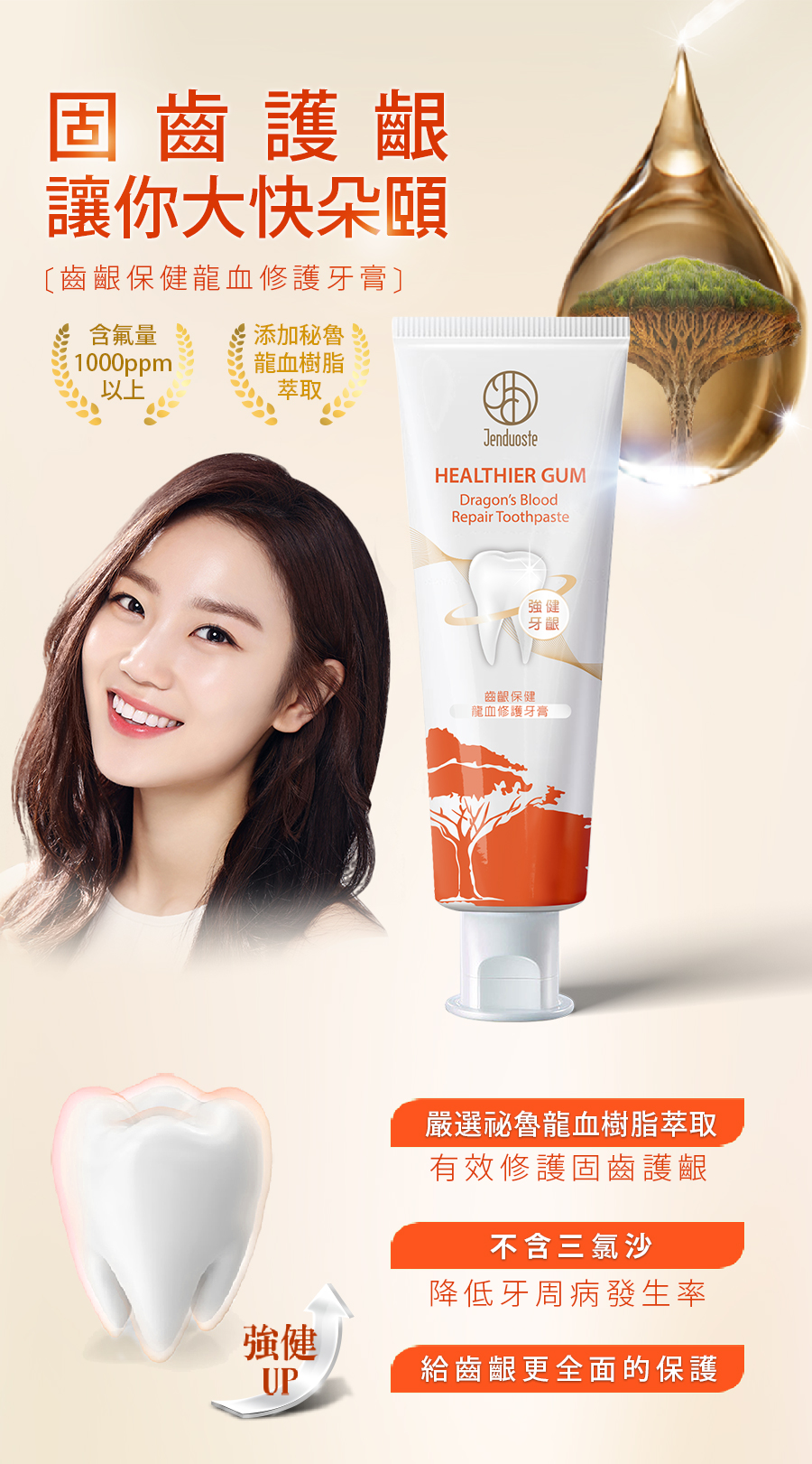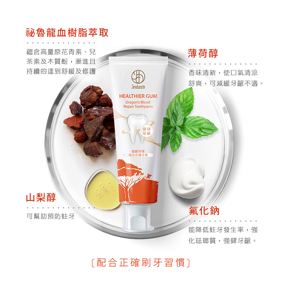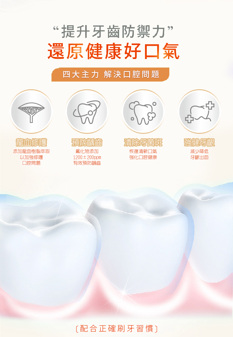 特性:配合正確刷牙習慣,可幫助強健牙齦、預防齲齒及清除牙菌斑,恢復清新口氣及強化口腔健康,特添加龍血樹脂萃取、薄荷醇,以加強修護口腔問題。